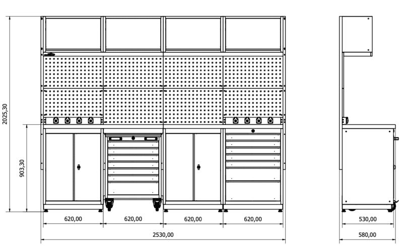 Tous les tiroirs des meubles de garage et toutes nos portes sont verrouillables. Les tiroirs sont munis de rails télescopiques et chaque tiroir reste démontable si besoin Options en bois ou en acier inoxydable pour nos plans de travail Plateau en hêtre massif 30 mm ou en de tôle d’acier inoxydable 30 mm. Vous souhaitez voir d'autre dimension de meuble de rangement voici notre meuble de garage atelier 4 éléments H2020xL2480xP530 mm Pour compléter l'organisation de votre espace de travail, explorez notre collection en visitant cette Elément de rangement haut pour garage ou encore cette solutions de rangement professionnel qui offre une capacité optimisée .